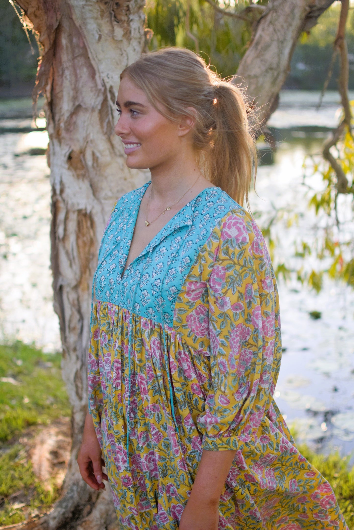 Our beautiful Frida maxi dress - Festival, is hand block printed. She comes with double ties, a long belt and pockets.