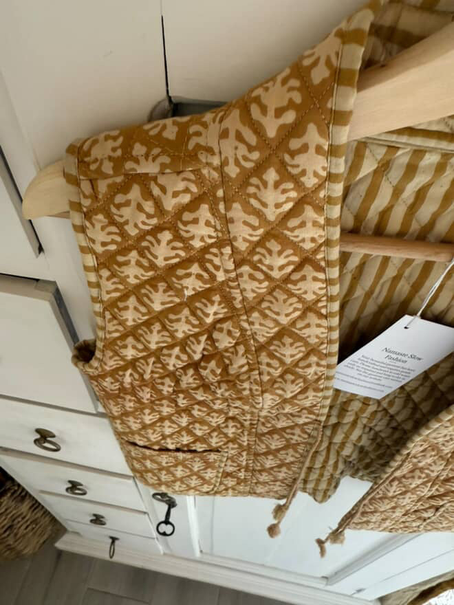 Soft as a cloud, our sample vest crafted by our artisans in Jaipur, this 100% cotton vest features traditional Bagru printing in earthy mustard. Lined and filled with light natural cotton for comfort, tassel tie closures for a charming finish. Reversable with one side striped and the other with motifs Snug fitting gilet style—perfect for layering across seasons.
