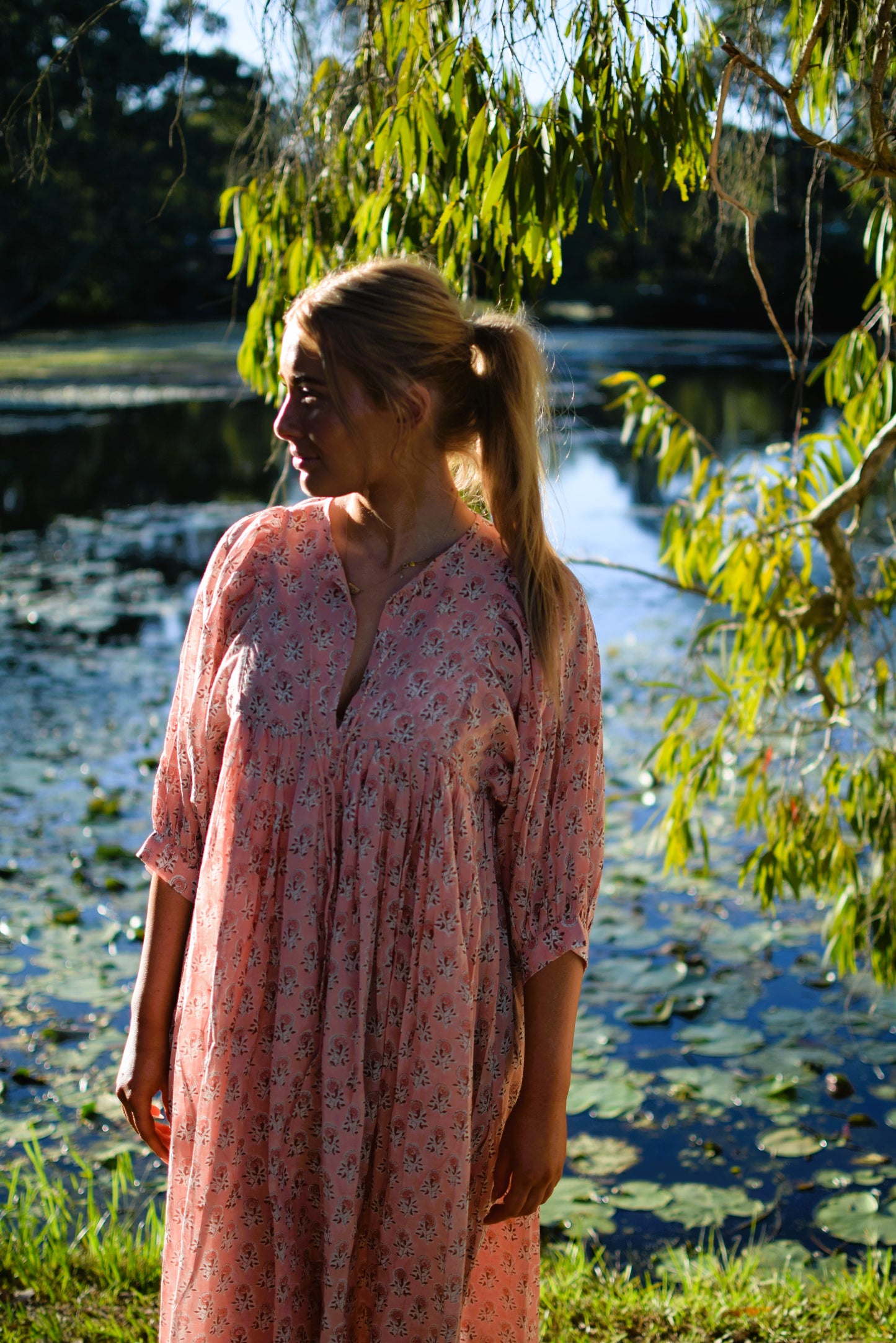 Our Lani midi dress in soft warm pink has delicate block printed flowers.